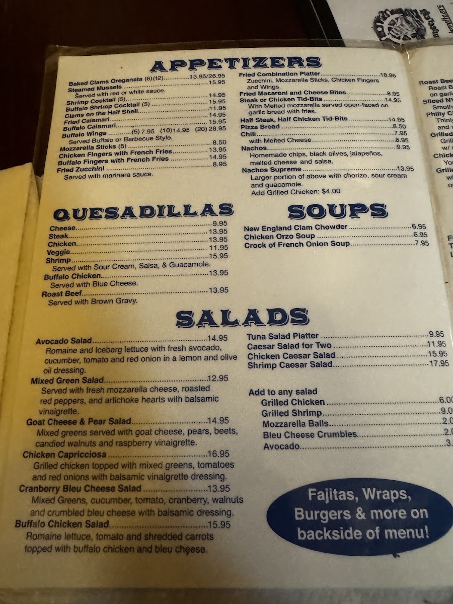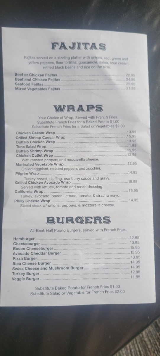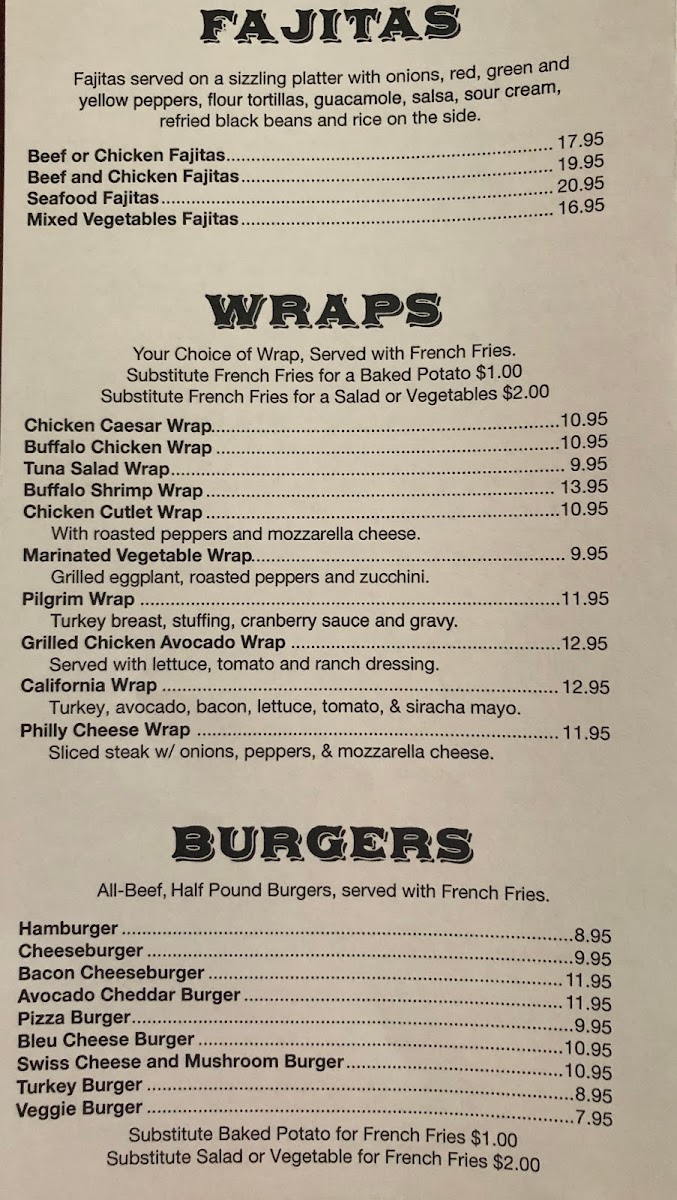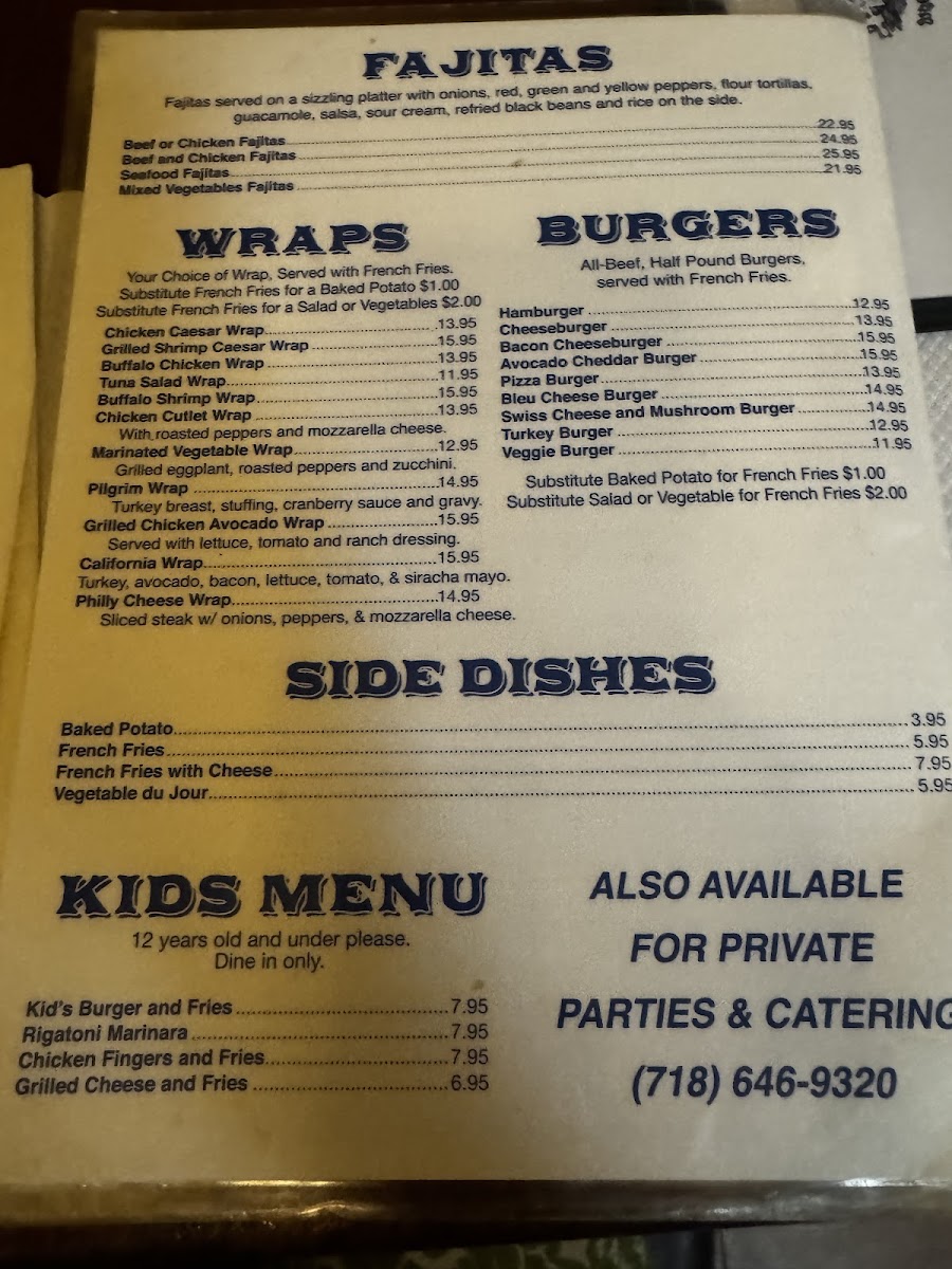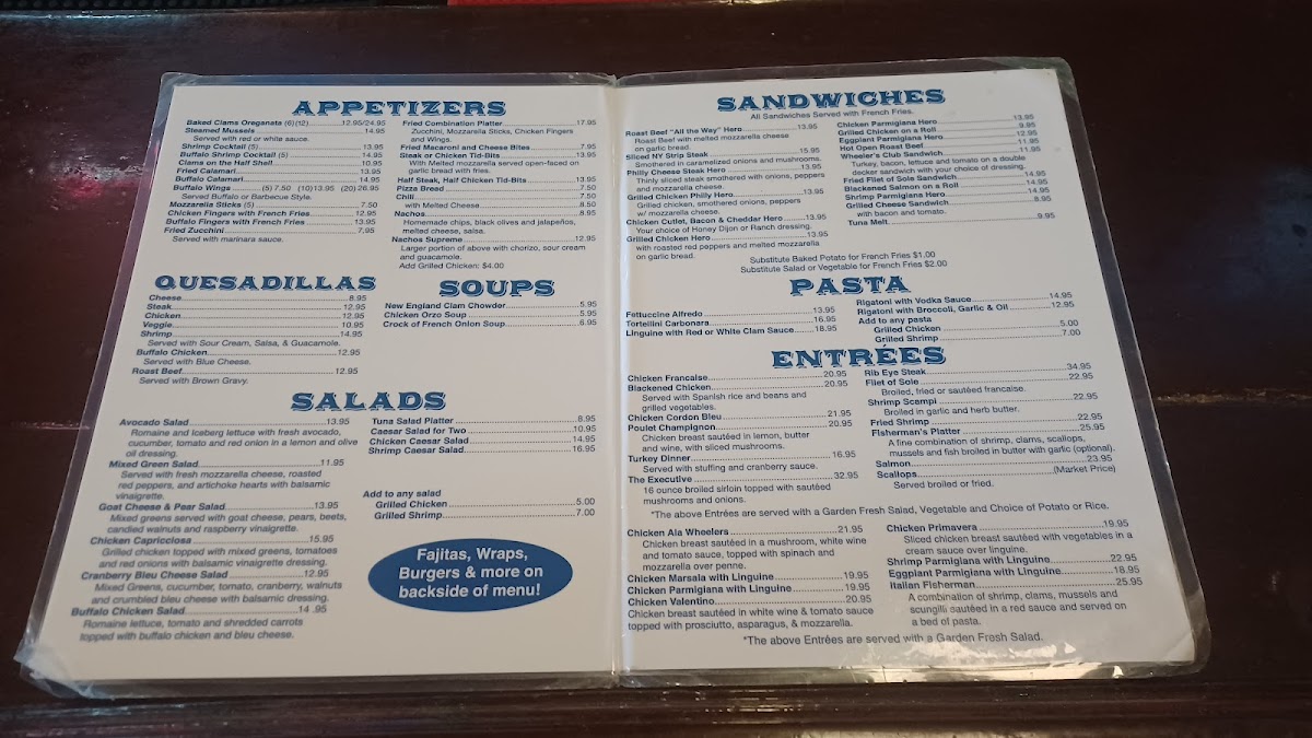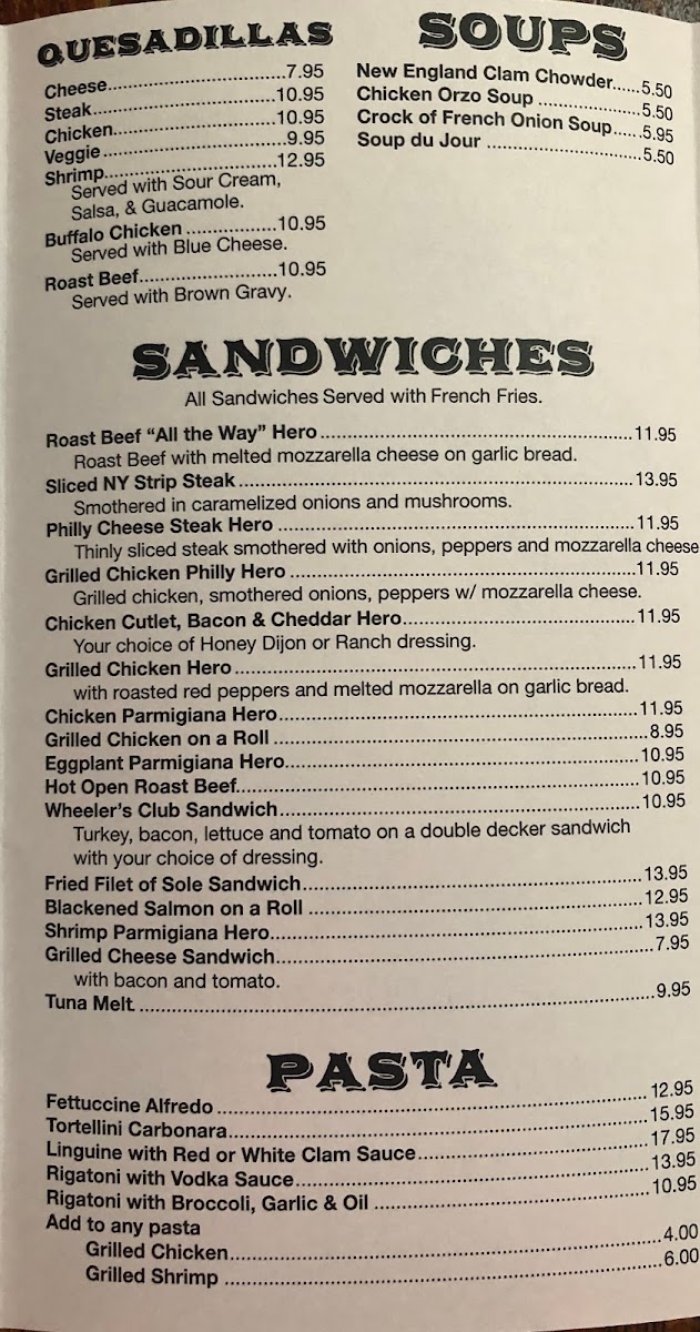 Wheeler’s offers a menu that strikes a balance between classic American comfort food and approachable casual dining. Expect hearty, familiar dishes that pair well with relaxed gatherings or a laid-back evening out. The offerings range from satisfying bar bites like Buffalo Wings and Chicken Fingers with Fries to more filling options such as the Roast Beef All the Way Hero and Italian Fisherman’s Platter.